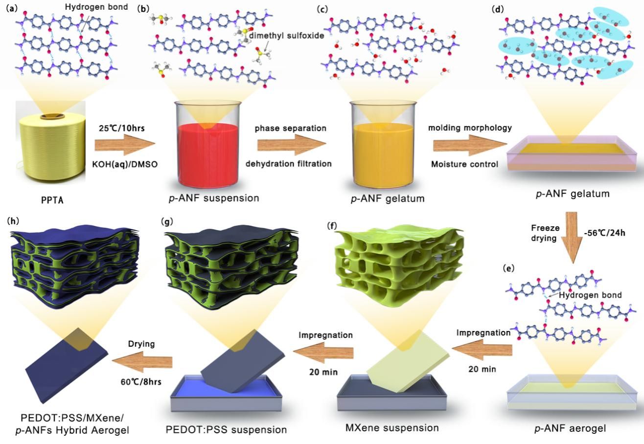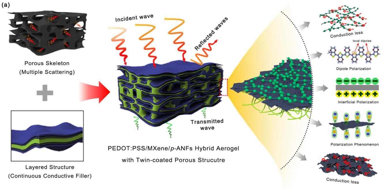 針對傳統(tǒng)電磁屏蔽材料反射效能高、效能不可諧調的瓶頸問題,提出“微孔骨架-梯度導電層”耦合策略,通過冷凍干燥與靜電自組裝實現(xiàn)p-ANFs、MXene與PEDOT:PSS的有序集成,創(chuàng)新性構建兼具微米孔與納米導電網(wǎng)絡的雙涂層氣凝膠。p-ANF形成的微孔骨架通過多重反射延長電磁波傳播路徑,增強吸收損耗;MXene層提供高導電網(wǎng)絡,PEDOT:PSS外層調控表面阻抗降低反射,突破吸收/反射性能的強關聯(lián)性矛盾,同時揭示微孔結構形變誘導導電網(wǎng)絡重構調控電磁損耗的規(guī)律,實現(xiàn)屏蔽效能41.27 dB,反射效能3.66 dB(達綠色屏蔽標準),絕對屏蔽效能達3063.7 dB·cm2·g?1。該研究成果可應用于5G通信、可穿戴設備、航空航天等領域,為解決電磁污染、提升精密設備穩(wěn)定性提供解決方案。