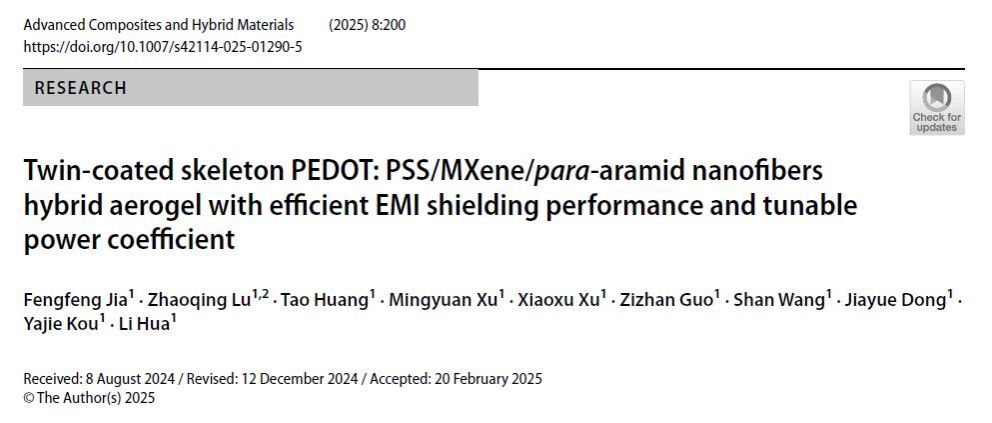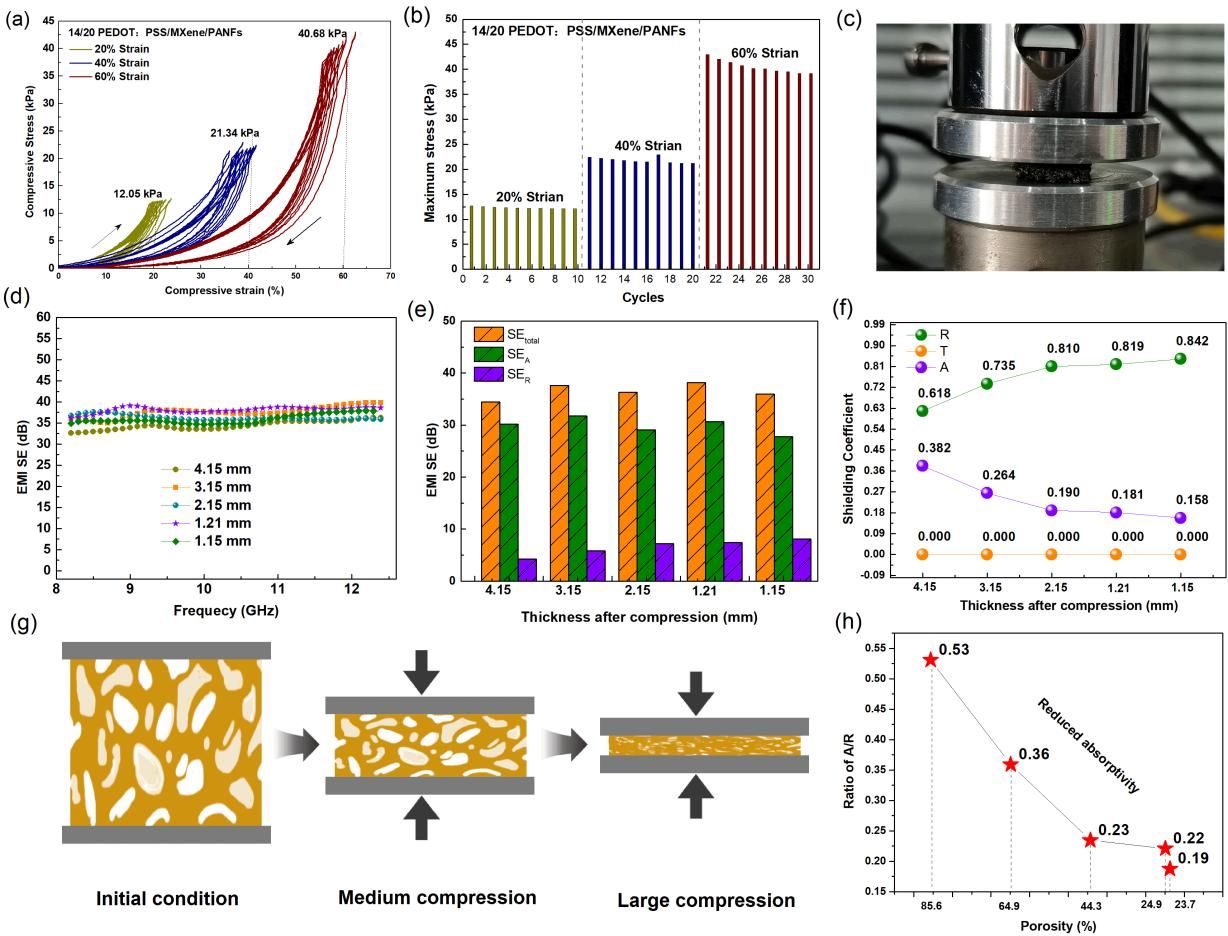 研究團隊提出“雙涂層骨架”設計策略,通過對位芳綸納米纖維(p-ANF)構建多孔骨架,依次浸漬MXene薄片與PEDOT:PSS導電鏈,形成分層多孔結構。該多孔結構壓縮形變可調控孔隙率,進而實現(xiàn)“反射-吸收”機制的靈活切換,為低反射和可諧調設計提供了新思路。相關工作以“Twin-coated Skeleton PEDOT: PSS/MXene/para-aramid Nanofibers Hybrid Aerogel with Efficient EMI Shielding Performance and Tunable Power Coefficient”為題發(fā)表在國際期刊《Advanced Composites and Hybrid Materials》(IF=23.2)。論文第一作者為師資博士后賈峰峰,通訊作者為陜西科技大學陸趙情、花莉教授。